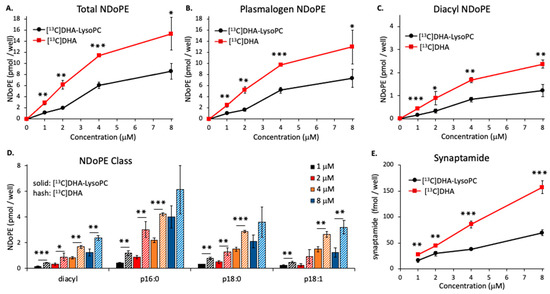 Concentration-dependent production of NDoPE and synaptamide from DHA and DHA-lysoPC. Neuro2A cells were incubated with either [13C]DHA-lysoPC or [13C]DHA in the presence of 2 μM URB597 for 8 h at 37 °C. The production of total NDoPE (A), plasmalogen NDoPE (B), and diacyl NDoPE (C) from these two substrates were comparatively analyzed after methylamine-mediated deacylation of the cell lipid extract. The main plasmalogen NDoPE species (p16:0-, p18:0-, and p18:1-NDoPE) are shown along with diacyl NDoPE (D). The production of synaptamide extracted from culture media is shown in (E). The significance of the differential production of these metabolites from DHA and DHA-lysoPC was evaluated by t-test. The values are the mean ± SD of three separate cultures. * p < 0.05; ** p < 0.01; *** p < 0.001.
