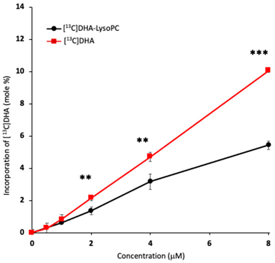 Concentration-dependent DHA incorporation into Neuro2A cells incubated with unesterified DHA or DHA-lysoPC. The cells were incubated with 1–8 μM [13C]DHA-lysoPC or [13C]DHA for 8 h at 37 °C and the cellular DHA content was analyzed by gas–liquid chromatography (GC) after transmethylation using 23:0 free fatty acid as an internal standard. The total uptake of [13C]-DHA by Neuro2A cells after the incubation with unesterified DHA or DHA-lysoPC was compared at equivalent concentrations after subtraction of basal DHA content. Values are the mean ± SD of three separate cultures. ** p < 0.01; *** p < 0.001.