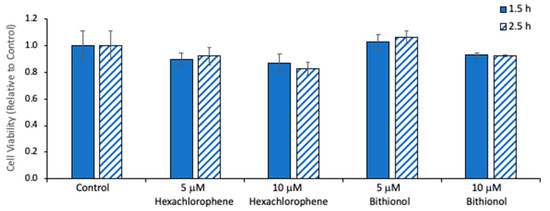 The cytotoxicity of N-acylphosphatidylethanolamine-phospholipase D (NAPE-PLD) inhibition was assessed in Neuro2A cultures. Previous studies indicated that hexachlorophene and bithionol produced only small decreases in HEK293 cell viability at concentrations of 8 and 10.5 μM, respectively [29]. On the basis of this information, we tested the effect of these inhibitors on Neuro2A cells at a concentration of 10 μM. As shown in Figure 5, no cytotoxicity was observed in 1.5 h incubations, but a 10–20% reduction in cell viability occurred at 2.5 h. Therefore, a 2 h incubation time, sufficient to obtain reproducible amounts of synaptamide production (Figure 1), was utilized to test the effect of the inhibitors on synaptamide production.