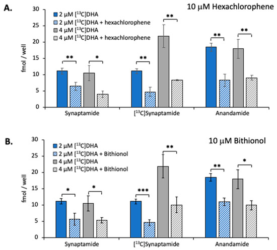 As seen in Figure 6, 10 μM hexachlorophene inhibited the production of [13C]synaptamide by 65% in Neuro2A cultures incubated with either 2 or 4 μM [13C]DHA in the presence of URB597 (Figure 6A, middle set of bars). Bithionol inhibited [13C]synaptamide production to a similar extent (Figure 6B, middle set of bars). The production of synaptamide (left set of bars) and anandamide (right set of bars) derived from endogenous substrates was also reduced by these NAPE-PLD inhibitors.