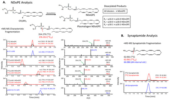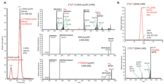 Characterization of [13C]DHA-lysoPC and [13C]DHA used as substrates. The DHA-lysoPC was analyzed by LC–MS and LC–MS/MS in the positive ion mode (A), and [13C]DHA by LC–MS in the negative ion mode (B). Approximately 87% of labeled or unlabeled DHA-lysoPC was sn-1-DHA isomer. Approximately 30% of DHA-lysoPC was fully labeled with [13C22] (A), while approximately 68% of unesterified [13C]DHA was fully labeled [13C22]DHA (B). Unlabeled free DHA was present at only 0.7%. The positional and/or isotopic distribution of the substrates was accounted for the quantitative evaluation of labeled products, NDoPEs and synaptamide. A pair of red dotted lines in the X-axis of (A) indicates a break in the m/z scale.