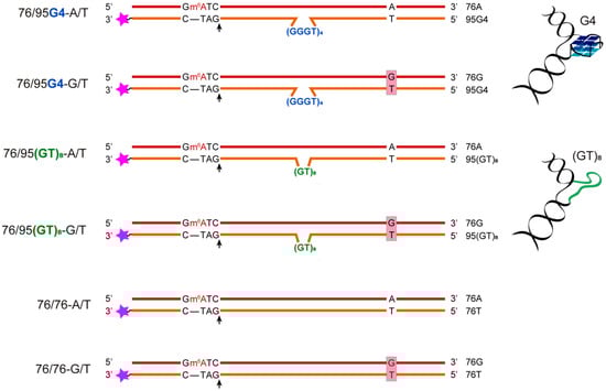 With the exception of the single-stranded telomeric DNA, all genomic G-rich sequences are always present along with their C-rich complements, and G4 formation competes with the corresponding Watson–Crick duplex. G4 formation, therefore, first requires local dissociation of duplex strands. Several in vitro studies have shown that in linear fragments under physiological conditions, G-rich sequences usually form DNA duplexes rather than G4s [25,26]. To preclude this outcome, we designed a stable analog of a G4 within a double-helical context. The newly developed DNA model was generated by hybridization of partly complementary strands, one of which contained the G4 motif d(TT-(GGGT)4-T) flanked with oligonucleotide fragments, while the opposite strand lacked the site complementary to the G4-forming insert. Therefore, in contrast to surrounding sequences, the central moiety cannot flip into B-DNA and compete with G4 formation. Steric factors determined by quadruplex topology greatly affect the ability of a G4 to coexist with a nearby duplex structure in the same DNA molecule. While antiparallel G4s have ends on the same side as their quadruplex core, the parallel type has ends on the opposite side, thereby facilitating its own placement within a double helix without any structured linker, unlike the antiparallel G4 [27]. The main working DNA models, 76/95 and 76/76, prepared by direct oligonucleotide synthesis, differ in the presence of a central insert (d(GGGT)4 or the control d(GT)8 sequence of the same size, which is unable to form a stable G4 structure within the looped area [28] and the presence of functional sites for MMR initiation: MutH recognition site 5′-Gm6ATC-3′/3′-CTAG-5′ (m6A is N6-methyl-2’-deoxyadenosine), the G/T mismatch, or a canonical A/T base pair (Figure 1). It should be noted that the flanking regions do not contain the sequences complementary to d(GGGT)4 and cannot interfere with the G4 folding.