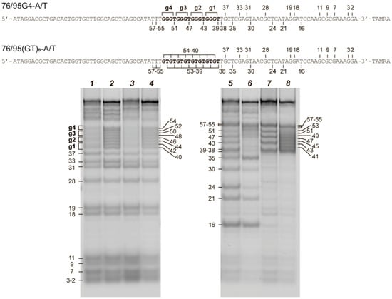 As an independent method for direct monitoring of G4 and duplex domains in the DNA models under study, we utilized chemical probing assays with DMS and KMnO4. G3 tracts in 76/95G4-A/T manifested reduced reactivity toward DMS, as compared with other guanines in the rest of the sequence, thus revealing the G4 structure formed by the d(GGGT)4 insert. In contrast, GT repeats in 76/95(GT)8-A/T showed no evidence of G4 formation in experiments with DMS- and KMnO4-induced modifications (Figure 3) [76]. The attenuation in the KMnO4 reaction corresponded to duplex regions in samples 76/95G4-A/T and 76/95(GT)8-A/T. In general, the results of both 1H NMR spectroscopy and chemical probing prove the formation of an intramolecular G4 structure stabilized in a double-stranded context.