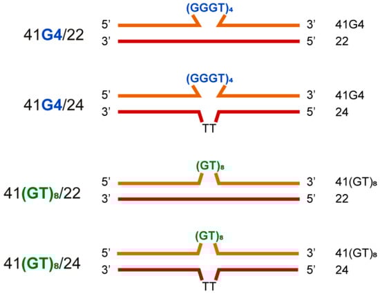 We applied a combination of CD and UV spectroscopy to further characterize the designed models. CD makes it possible to determine G4 topology [37], whereas UV spectroscopy allows for independent monitoring of G4 and DNA duplex unfolding [38]. For optical measurements, the shorter double-stranded DNA models (Figure 4) and their single-stranded components were used to improve the signal-to-noise ratio, because G4-flanking sequences that contribute to CD and UV spectroscopy signals do not participate in the folding/unfolding of G4. Together with the 41/22 models (41G4/22 and 41(GT)8/22), we examined 41/24 ones (41G4/24 and 41(GT)8/24), in which partially complementary shorter strands included two additional T residues in the middle of the sequence to reduce possible tension at the junction of double-stranded regions with the insert, d(GGGT)4 or d(GT)8, and to facilitate G4 formation.