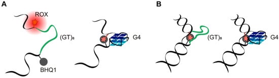 In addition to conventional methods, the secondary structure of single- and double-stranded DNA models was probed by means of double-labeled 41-nt DNAs with rhodamine X fluorophore (ROX) as a fluorescent reporter and black hole quencher (BHQ1) as a quencher attached at the C5 position of internal thymine residues at 5′ and 3′ ends of the G4 motif (or control sequences), respectively (Table S1). A schematic representation of mutual arrangements of the two chromophores depending on the secondary structure elements is given in Figure 7; DNA duplex formation and/or G4 folding is believed to bring ROX and BHQ1 closer to each other, thereby causing fluorescence quenching. This method has not previously been applied for these purposes. The results obtained (Figures S1 and S2, Table S2, and corresponding annotations in the Supplementary Materials) constitute the first experimental evidence that chromophores ROX and BHQ1 can help to detect G4 formation in single-stranded DNA, although the quenching effects are rather modest. Nonetheless, this approach did not prove to be promising for G4 detection in a double-stranded context when, as in our case, the reporter and quencher moieties are in the same strand. On the other hand, it was found that ROX–BHQ1 dual-label DNA models could be applicable to the monitoring of duplex formation, regardless of the insertion sequence.