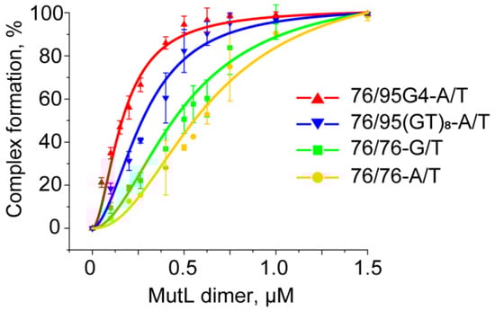 MutL has weak DNA-binding activity, which is largely dependent on DNA length [48]. The size of the DNA site bound by MutLs from different species varies from 30 bp in the case of Aquifex aeolicus MutL [49] to somewhere between 250 and 500 bp for yeast Mlh1–Pms1 [50]. Although complexes of ecMutL with 41-bp DNA have been detected [51], the involvement of MutL from R. sphaeroides (rsMutL) in DNA binding remains unknown. It has been previously shown that MutL binding to DNA can be clearly observed in low-salt conditions, and this process is ATP-independent [48,50,52]. Given these data, we investigated the binding of ecMutL and rsMutL to a TAMRA-labeled 209-bp DNA duplex in the EMSA. We hoped that the DNA length of 209 bp will be long enough to assess previously unknown DNA-binding properties of rsMutL. Although 2.0–2.5 μM ecMutL formed a complex with 100 nM 209-bp DNA with 100% efficiency, no interaction between rsMutL and the same DNA sample was observed even with a 20-fold excess of the protein (Figure S6). Nevertheless, rsMutL was found to nick the pUC-MMR plasmid in the presence of certain divalent metal ions, thus proving its activity (Figure S7). The lack of rsMutL affinity for 209-bp DNA suggests that the binding of this protein to every 76/95 DNA model is highly unlikely. Therefore, we evaluated relative binding affinity of only MutL from E. coli for TAMRA-labeled 76/95G4-A/T, 76/76-G/T, 76/95(GT)8-A/T, and 76/76-A/T (Figure 8 and Figure S8). Of particular interest was the assay of ecMutL binding to a G4-containing DNA duplex because the role of G4 in MutL functioning is not clear so far. According to our data, ecMutL efficiently interacts with 76/95G4-A/T (Figure S8A). The binding extent of 0.1 μM ecMutL toward this ligand was revealed to be 1.9-fold higher than that toward a DNA duplex with an unstructured d(GT)8 loop, and at least 3.7-fold higher than that toward the perfect duplex 76/76-A/T and mismatched duplex 76/76-G/T (Figure 8). Nevertheless, KDapp of the ecMutL–76/95G4-A/T complex (~200 nM) is almost an order of magnitude higher than KDapp of the ecMutS complex with the same G4-containing DNA ligand (Table 2), indicating that in the presence of these two principal components of the MMR, MutS preferentially interacts with a G4 in a duplex context, at least in vitro.