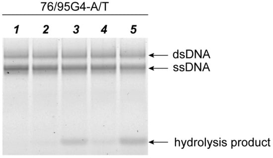 The MutH protein is known to nick the unmethylated strand at a 5′-Gm6ATC-3′/3′-GATC-5′ monomethylated site launching a further repair process; the presence of both MutS and MutL significantly enhances the efficiency of DNA hydrolysis [53]. We studied the hydrolysis of each DNA ligand—76/95G4-A/T, 76/76-G/T, 76/95(GT)8-A/T, and 76/76-A/T—under the action of ecMutH. Of note, DNA ligands 76/95G4-A/T and 76/95(GT)8-A/T contain a MutH monomethylated recognition site, whereas G4 or d(GT)8 inserts are located in the unmethylated longer strand (Table S3). DNA duplexes 76/76-G/T and 76/76-A/T served as the controls. A MutH-mediated nick in the “bottom” DNA strand resulted in the formation of a 3′-labeled 18-nt product, which was separated from the nonhydrolyzed DNA ligand by gel electrophoresis under denaturing conditions, allowing for evaluation of the cleavage efficiency (Figure 9).