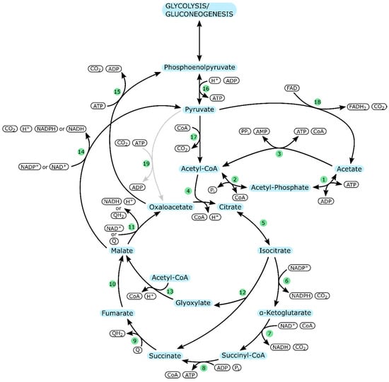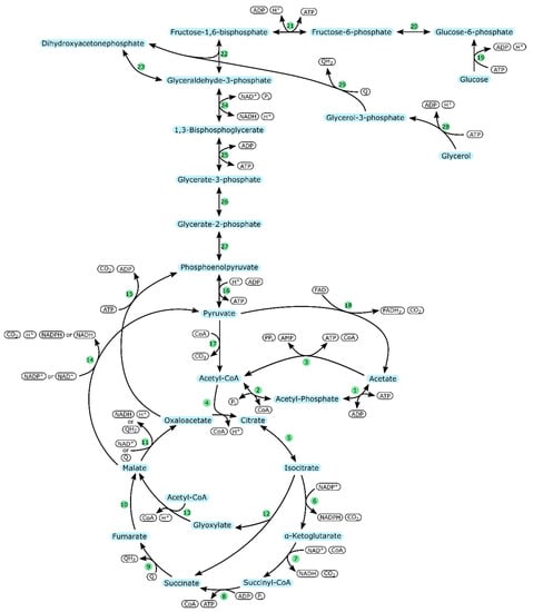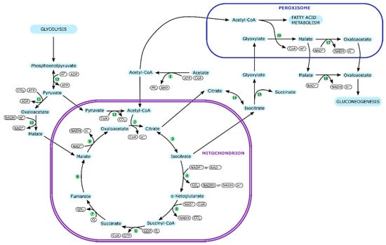 Acetate metabolism in Y. lipolytica. Arrows indicate the preferred direction of reactions. Enzymes are represented by numbers in green circles (cf. Table 3).