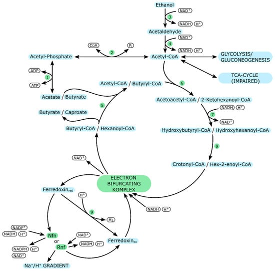 C. kluyveri has gained biotechnological importance due to its ability to produce medium-chain organic acids from acetate and ethanol [,]. The cells can accomplish that by implementing a reverse β-oxidation, outlined in Figure 3.