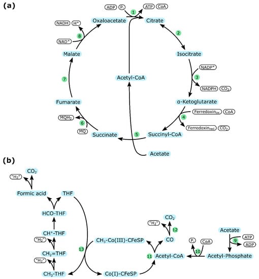 Metabolic adaptations of sulfate-reducing bacteria to utilize acetate: (a) modified citric acid cycle as used by Desulfobacter postgatei; (b) reverse Wool–Ljungdahl pathway as employed by organisms like Desulfobacter autotrophicum; arrows indicate the preferred direction of reactions. Enzymes are represented by numbers in green circles (cf. Table 5). “H2” indicates the generation of two protons and two electrons, which may result in the formation of reduced ferredoxin, NADH, or NADPH.