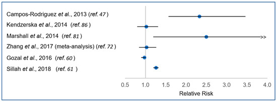 | Choi (2019) [69] | Retrospective study. Data were retrieved from a national health insurance database. SDB was diagnosed based on ICD-10 codes Subjects were followed for 3.7 ± 2.3 years. | 45,699 women >20 years with SDB and 228,502 age-matched control women without ICD-10 codes corresponding to SDB | -The incidence of breast cancer among women with OSA was significantly higher than that among the controls (HR 1.20, 95%CI 1.04–1.39). -The incidence of breast cancer was higher among patients aged ≥65 years (HR 1.72; 95%CI 1.10–2.71). |