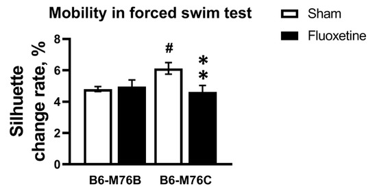 Effect of chronic fluoxetine administration on mobility (estimated as silhouette change rate) in a forced swim test. n ≥ 15 for each group. All values are presented as mean ± SEM. ** p < 0.01 compared to control mice of the same line, # p < 0.05 compared to control B6-M76B mice.