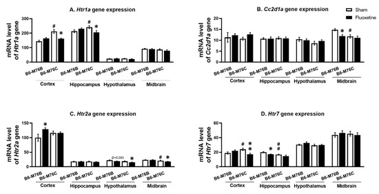 Htr1a (A), Htr2a (C) and Htr7 (D) receptor and Cc2d1a (B) genes expression in the brain structures of control and chronically-treated-with-fluoxetine B6-M76C and B6-M76B mice. Gene expression is presented as the number of complementary DNA (cDNA) copies with respect to 100 cDNA copies of rPol2a, n ≥ 8 for each group. All values are presented as mean ± SEM. * p < 0.05, ** p < 0.01 compared to control mice of the same line, # p < 0.05, ## p < 0.01 compared to control B6-M76B mice.