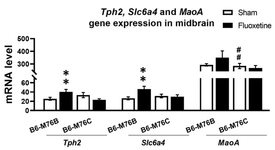 Chronic fluoxetine treatment resulted in significantly (p < 0.01) increased expression of gene encoding key enzyme for 5-HT synthesis in the brain–tryptophan hydroxylase-2 in the midbrain of B6-M76B mice (Figure 4). Two-way ANOVA showed the effect of genotype x drug interaction (F1.25 = 11.1, p < 0.01) for the Tph2 mRNA level in midbrain. A similar fluoxetine-induced increase was observed in B6-M76B mice for the expression of gene encoding 5-HT transporter realizing 5-HT reuptake from synaptic cleft (Slc6a4) (Figure 4). Two-way ANOVA revealed the effect of genotype x drug interaction (F1.29 = 5.5, p < 0.05) for the Slc6a4 mRNA level in the midbrain. Post hoc analysis showed significant (p < 0.01) increase in Slc6a4 gene expression in B6-M76B mice after chronic fluoxetine treatment. At the same time, fluoxetine treatment failed to affect the expression of the gene encoding the main enzyme for 5-HT degradation–monoamine oxidase A (Maoa) (Figure 4). However, B6-M76B mice from the control group demonstrated significantly higher (p < 0.01) expression of the Maoa gene compared to that in the B6-M76C mice (F1.24 = 19.1, p < 0.001 for the effect of genotype) (Figure 4).