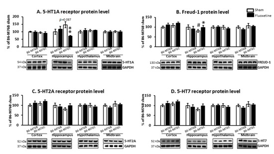 Chronic fluoxetine administration did not affect 5-HT2A and 5-HT7 receptors protein levels in all investigated brain structures. Control B6-M76C mice did not differ from control B6-M76B mice in the expression of these receptors (Figure 5C,D).