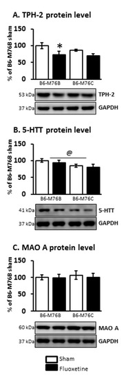 At the same time, the two-way ANOVA demonstrated the effect of the drug on TPH-2 protein level in the midbrain (F1.21 = 6.8, p < 0.05). Fluoxetine treatment resulted in a considerable decrease (p < 0.05) in the expression of this key enzyme for 5-HT biosynthesis in the brains of B6-M76B mice (Figure 6). The two-way ANOVA also showed the effect of genotype on 5-HTT protein level in the midbrain (F1.16 = 4.8, p < 0.05). However, the post hoc analysis retrieved no significant changes in 5-HTT expression. Chronic fluoxetine treatment failed to affect the MAO A protein level in the midbrain of both investigated mouse lines as well (Figure 6).