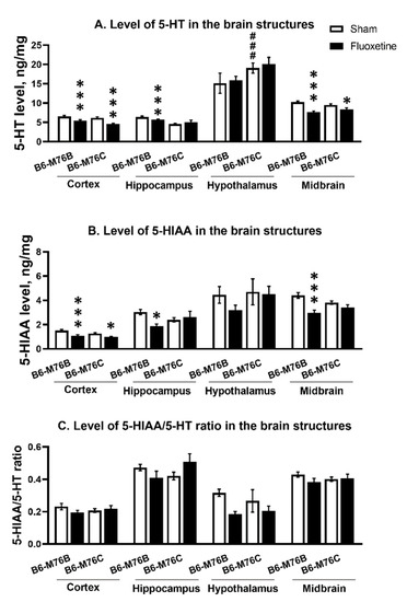 Level of 5-HT (A) 5-HIAA levels (B) and 5HIAA/5-HT ratio (C) in the brain structures of control and chronically-treated-with-fluoxetine B6-M76C and B6-M76B mice. Levels of 5-HT and 5-HIAA are presented in ng/mg, n ≥ 8 for each group. All values are presented as mean ± SEM. *** p < 0.001; * p < 0.05 compared to control mice of the same line; ### p < 0.001 compared to control B6-M76B.