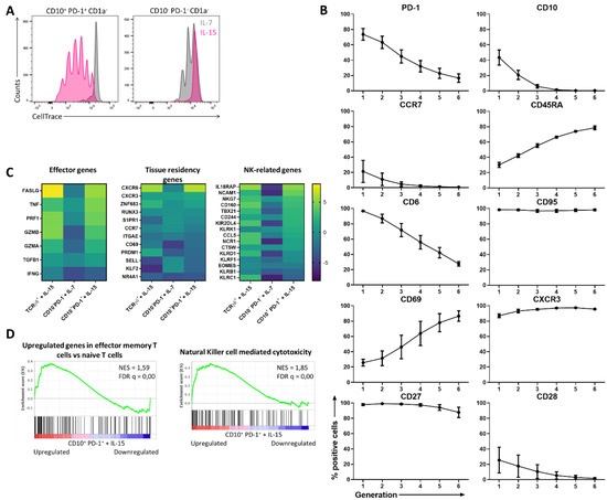 The proliferation of CD10+ PD-1+ IELps with IL-15 induces innate and effector characteristics. (A) Proliferation assessed by CellTrace Violet dye dilution in IELps and conventional T cells isolated from the human postnatal thymus, after 5 days of incubation in the presence of IL-7 (10 ng/mL) or IL-15 (10 ng/mL). Representatives of at least five experiments; (B) phenotypical changes of the IELps during proliferation with IL-15, measured using flow cytometry and plotted per generation (Figure S2) (mean ± SEM, n = at least 2); (C) heatmap for log2 fold change for selected genes, including effector genes, tissue residency genes, and NK-related genes, expressed in TCRγδ+ cells incubated with IL-15, conventional T cells with IL-7 and IELps with IL-15 for 11 days, compared to the same population freshly isolated from human postnatal thymus at day 0; (D) Gene Set Enrichment Analysis (GSEA) on IELps proliferated with IL-15 compared to freshly sorted IELps cells from human thymus. Left: genes upregulated in effector memory T cells compared to naive T cells as described by Gattinoni et al. [21]. Right: KEGG gene set of genes associated with NK-mediated cytotoxicity (hsa04650). Normalized enrichment score (NES) and false discovery rate q value (FDR q) are shown.