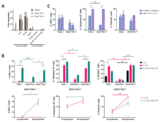 The TCRγδ+ population and CD10+ PD-1+ population were cultured with IL-15 for 6 days after which they were stimulated by the addition of IL-12 + IL-18 (both 10 ng/mL) for 48 h. Brefeldin A was added during the last 4 h. On the other hand, the TCRγδ+ population and CD10+ PD-1+ population were cultured with IL-15 for 7 days and 20 h before they were stimulated by the addition of PMA (1 ng/mL; Sigma-Aldrich, Diegem, Belgium; 16561-29-8) and ionomycin (0.5 µg/mL; Sigma-Aldrich, 56092-82-1) for 4 h, during which also brefeldin A was added. After stimulation, the cells were harvested, fixed, permeabilized, and stained for IFN-γ, granzyme B, and perforin as described above.