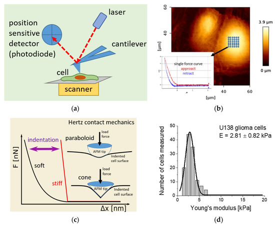 Atomic force microscopy (AFM) is mainly recognized as a technique applied to visualize surface topography with nano- or subnanometer resolutions. Currently, with the gathered research data, it has been shown that AFM can be successfully employed in the nanoscale measurements of biological samples, such as proteins or living cells [1,2,3]. Compared to other high-resolution techniques such as scanning/transmission/cryo-electron microscopy, the essential advantage of AFM is the capability to measure the biophysical properties of biological samples in physiologically relevant conditions. Till now, this technique has been widely applied to study the nanomechanical properties of healthy and pathologically altered cells and tissues; those elastic properties were quantified through an elastic (Young’s) modulus [4,5,6,7,8,9]. In one of the first papers, it has been demonstrated that AFM-based nanomechanical characterization can be applied to cancer cells. The results revealed larger deformability of bladder cancer cells than non-malignant cells (a larger deformability denotes a smaller Young’s modulus). A significantly lower Young’s modulus was correlated with a poorly differentiated cell cytoskeleton [3]. At present, it is well-established that cancer progression manifests or induces the alterations in cell deformability in the majority of cancers, including thyroid [4], ovarian [10], breast [11,12,13,14], prostate [15], bladder [16,17], and pancreas [18]. Moreover, for some cancers like ovarian cancer [10] and melanoma [19], it is possible to correlate larger cellular deformability with cancerous cells’ invasiveness.
