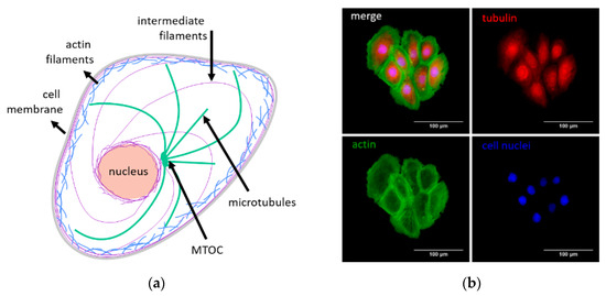 (a) A scheme showing the organization of three main cytoskeletal elements (actin and intermediate filaments, microtubules) inside the cell in relation to the cell membrane and nucleus (MTOC–a microtubule-organizing center). (b) Exemplary fluorescent images were collected for DU145 prostate cancer cells showing labeled actin filaments and microtubules.