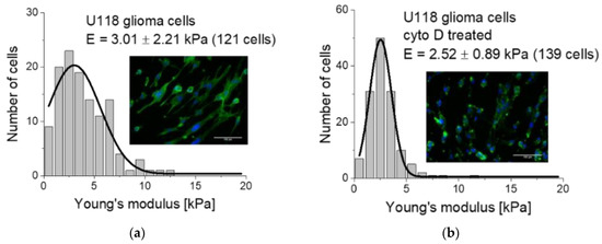 The most common agents affecting actin filaments’ organization belong to the cytochalasin family, encompassing several toxins. Members such as cytochalasin B and cytochalasin D are applied to disrupt F-actin, a polymerized form of actin [41,42]. A low Young’s modulus value characterizes the observed increase in cell deformability. Due to the F-actin disruption, a cell becomes more homogenous in terms of mechanical properties, observed as a narrow elastic modulus distribution. Exemplary data showing the nanomechanical properties of U118 glioma cells treated with cytochalasin D are presented in Figure 3a,b.