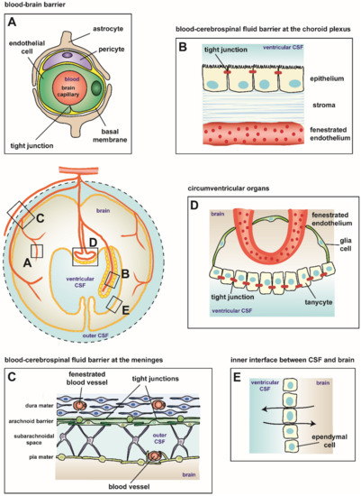 Interfaces between the peripheral tissue and the central nervous system (CNS). (A) The blood–brain barrier (BBB) consists of the brain microvascular endothelial cells, connected by tight junctions (TJs), in conjunction with astrocytes and pericytes, and separates the brain parenchyma from the blood. (B) The choroid plexus, which is located in the ventricular system, is highly vascularized by a fenestrated endothelium that is placed in the stroma. At the choroid plexus, the blood–cerebrospinal fluid (CSF) barrier (BCSFB) is formed by epithelial cells connected by TJs and separates the blood from the ventricular CSF. (C) At the meninges, the dura mater contains fenestrated blood vessels. The arachnoid mater is located adjacent to the dura mater and encloses the subarachnoidal space (SAS) that contains the outer CSF. The BCSFB barrier function of the meninges is formed by the cells of the arachnoid mate, which are connected by TJs. Furthermore, a BCSFB barrier function can be postulated for endothelial cells of pial vessels, which cross the SAS and merge into brain capillaries, but are not covered by pericytes and astrocytic endfeets. (D) The blood vessels of the circumventricular organs (CVOs) are fenestrated. The barrier towards the ventricular CSF is formed by TJs between adjacent specialized ependymal cells, termed tanycytes. Glia cells (with TJs) shield against the brain parenchyma. (E) Ependymal cells lining the ventricles separate the ventricular CSF from the brain parenchyma. This figure is adapted from [14].