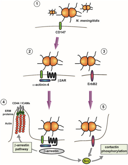 Adhesion of Neisseria meningitidis to the endothelium. (1) In an initial step, meningococci adhere to the immunoglobulin superfamily member CD147 on the surface of host cells. (2) Subsequently, the G protein coupled β2-adrenergic receptor (β2AR) forms heteromeric complexes with CD147 that are stabilized by α-actinin-4. (3) Adhesion of N. meningitidis also leads to the recruitment of the ErbB2 receptor. (4) Activation of β2AR in return causes activation of the β-arrestin pathway, leading to plasma membrane remodeling and the recruitment of ERM proteins (Ezrin and Moesin), together with ERM-binding transmembrane proteins (CD44 and ICAMs) and cortical actin (cortical plaque formation). Src is also recruited and activated. (5) Association of N. meningitidis with ErbB2 leads to recruitment and activation of Src, which in turn causes phosphorylation of cortactin (which triggers the formation of membrane protrusions).