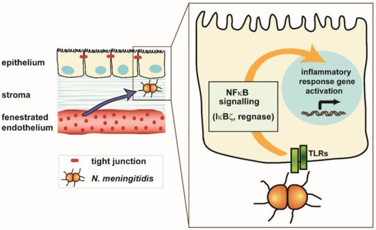 Interaction of Neisseria meningitidis with the choroid plexus epithelium. At the choroid plexus, the endothelial cells forming the capillaries are fenestrated and separated from the epithelium, which is tightly sealed by tight junctions, by a stroma. Meningococci reaching the epithelial cells interact with toll like receptors (TLRs), resulting in an NFκB-mediated activation of a pro-inflammatory immune response. NFκB signaling involves the transcription factor IκBζ as well as the ribonuclease regnase that mediates posttranscriptional regulation of inflammatory immune response genes.