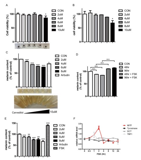 2.1. Carvedilol Suppresses Melanogenesis