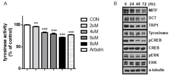 Melanogenesis is a complex process that involves numerous pathways. Tyrosinase, tyrosinase-related protein 1 (TRP-1), and TRP-2, also called dopachrome tautomerase (DCT), are the three main melanocyte-specific enzymes involved in melanin synthesis []. Melanogenesis is induced or inhibited by numerous factors, including hormones, cytokines, neurotransmitters, growth factors, and micromolecules [,,].