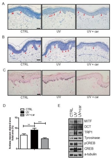 Carvedilol suppresses UVR-induced melanin accumulation in ex vivo human skin. (A) Microscopic images of Melan-A immunohistochemistry for melanocyte staining. Arrowheads indicate positive Melan-A staining (red color). Bar = 50 μm. (B) Microscopic images of HMB45 immunohistochemical staining for melanocytes. Arrowheads indicate positive HMB45 staining (red color) Bar = 50 μm. (C) Representative images of Fontana–Masson-stained paraffin-embedded sections treated with vehicle (control), UVB + vehicle, or UVB + carvedilol. Bars = 50 μm. (D) The ratio of the Fontana–Masson-stained area per total area for control, UVB, and UVB + carvedilol. (E) Cell lysates of control, UVB, and UVB + carvedilol were analyzed by Western blot using antibodies, MITF, DCT, TRP1, tyrosinase, and p-CREB, and total CREB and equal protein loading were confirmed by α-tubulin. Data are expressed as the means ± SD of three independent experiments. ** p < 0.01, *** p < 0.001 vs. controls.