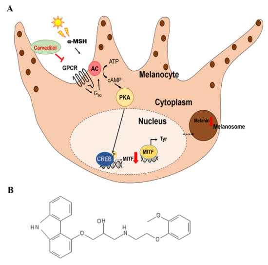 Summary of the mechanistic pathway by which carvedilol affects melanogenesis. (A) Summary of the mechanistic pathway underlying the effect of carvedilol on melanogenesis. (B) Chemical structure of carvedilol (1-(9H-carbazol-4-yloxy)-3-[2-(2-methoxyphenoxy) ethylamino] propan-2-ol). (