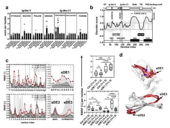 Short disordered epitopes of CRTAM Ig-like domains. (a) Linear B-cell epitope predictions by different algorithms (threshold = 0.5, 10% F.P). Each point represents the score for each residue of the epitope sequence. (b) Prediction of the intrinsically disordered region of the murine CRTAM sequence. The top panel shows the scheme of the CRTAM protein: Ig-like variable and constant domains, stalk, transmembrane (TM), cytoplasmic region, and PDZ-binding motif ESIV. The black lines in the Ig-like domains represent the locations of short disordered epitopes (sDEs); the predictor consensus is shaded in gray (standards errors from algorithms: IUPRED2A, PrDOS, DISOPRED3, and DisEMBL), and PONDR-VSL2 is indicated by the black line. The groups of residues (peaks) with scores of ≥0.5 are defined as short (gray boxes) or long (black boxes) intrinsically disordered regions (IDR1-5). (c) Behavior of the amino acid fluctuations according to CABS-flex coarse-grained molecular dynamics. The plot represents the RMSF of the control structure (4H5S-A) or murine CRTAM models (m-IgV or m-IgC1) in two conditions (T = 1.0 and T = 1.5). The RMSF averages of sDE1-3 are shown in the box and whisker (min to max) plots and were evaluated by one-way ANOVA (*** p < 0.001, **** p < 0.0001, ns = not significant). (d) Structures are representative of 10 models using CABS-flex MD at T = 1.5 from Ig-like V or C1 domains: each sDE is shown in red, and ambiguous structures are indicated with blue arrows.