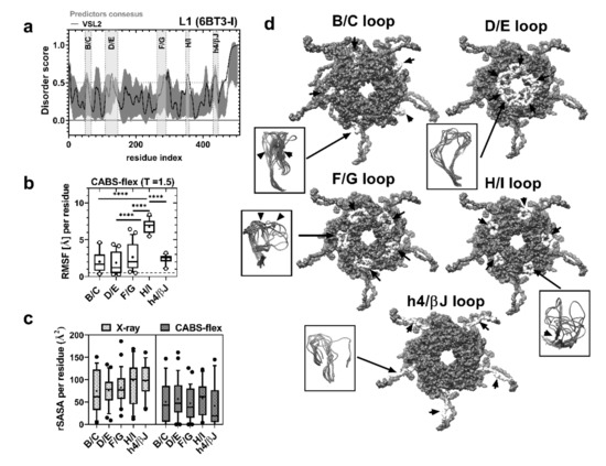 L1 epitopes are short disordered regions. (a) Prediction of the intrinsically disordered region of the L1 HPV16 sequence (6BT3-I). PONDR (black line) and predictor consensus (dark gray shades) are shown (dotted line, threshold = 0.5). The light gray boxes designate the described antigenic loops of the L1 viral protein (B/C, D/E, F/G, H/I, and h4/βJ). (b,c) RMSF (Å) from CABS-flex at T = 1.5 and average relative SASA (Å2) from L1 antigenic loops, evaluated by one-way ANOVA (**** p < 0.0001). (d) Representation of the surface accessibility of antigenic loops (white surfaces labeled with black arrows) in the L1 pentamer (PDB: 3J6R): the loops are representative of 10 models predicted by CABS-flex, and their ambiguous folding regions are indicated (black arrows).