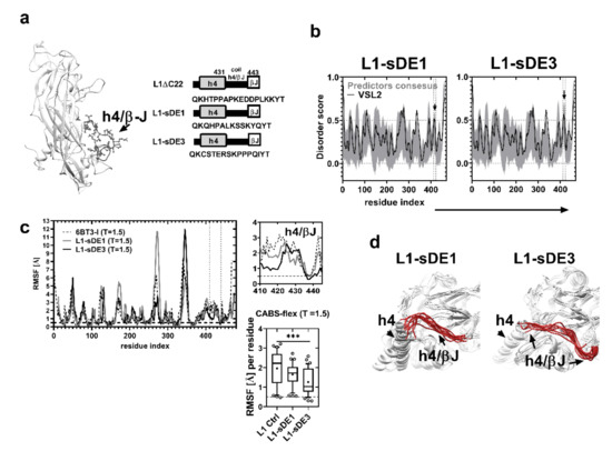 CRTAM sDEs retain their flexibility in chimeric L1 viral protein. (a) L1 3D model (the h4/βJ loop is indicated). Chimeric construct scheme (right) of each synthetic gene; different structures are indicated by gray shaded boxes (helix 4), white boxes (βJ), and thick black lines (h4/βJ loop). The top panel shows the native residue sequence (L1ΔC22), and the middle and bottom panels show the CRTAM epitopes that were replaced in the native sequence (L1-sDE1 and L1-sDE3). (b) Prediction of the intrinsically disordered region of chimeric viral protein sequences: the gray shaded areas and black line denote the predictor consensus and PONDR-VSL2, respectively; the residues that constitute IDR and CRTAM epitopes are indicated with black arrows. (c) Behavior of RMSF of chimeric viral proteins and control from CABS-flex MD at T = 1.5: the top panel (right) shows a close-up of a selected area corresponding to the h4/βJ loop (430–443); the bottom panel (right) shows the average RMSF of sDEs from chimeric viral proteins at T = 1.5, evaluated by one-way ANOVA (*** p < 0.001). (d) Three-dimensional models from chimeric L1 proteins: CRTAM sDEs in the h4/βJ loop are in red, and the h4 helix structures are indicated with black arrows.