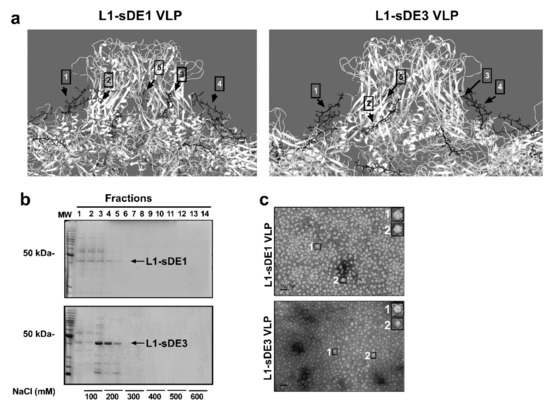 Chimeric viral proteins assembled into virus-like particles. (a) Full chimeric viral capsid of each construct reconstructed by crystal symmetry coordinates of the reported L1 structure: disordered epitopes are in black (sDE1 and sDE3), labeled with black arrows and numbers for each chimeric L1 monomer. (b) SDS-PAGE of the fraction from chromatographic purification of L1-sDE1 (top) or L1-sDE3 (bottom). Black arrows show the molecular weights of purified proteins, and the concentrations of NaCl used for purification are indicated at the bottom of the figure. (c) Transmission electron microscopy of chimeric viral proteins assembled into VLPs. A close-up view of assembled VLPs, scale bar = 50 nm.