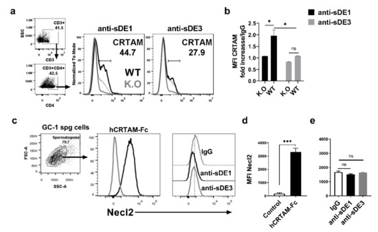 We evaluated the cross-reactivity of both polyclonal antisera with Necl2. To achieve this goal, we used the GC-1 spg cell line, which has been reported to express high levels of Necl2 [69]. Necl2 expression was observed in GC-1 spg cells when hCRTAM-Fc recombinant protein was used as a positive control for the detection of this protein (Figure 5c,d). In contrast, no reactivity was observed with anti-sDE1 or anti-sDE (Figure 5e). This result reveals that despite some similarities among the extracellular domains between CRTAM and Necl2, sDE1 and sDE3 are specific to CRTAM.