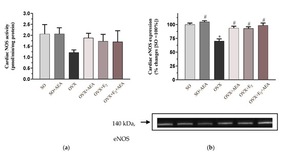 As shown in Figure 1a, AEA treatment did not cause any changes in cardiac NOS activity in SO animals. NOS activity values were reduced in estrogen-depleted animals; however, two weeks of AEA treatment improved the OVX-induced unfavorable alterations. A similar compensatory effect was observed in OVX rats treated with E2 and with E2 + AEA.