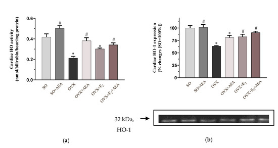 Effects of anandamide and estrogen treatment on cardiac activity and expression of the HO enzyme in SO and OVX animals. (a) Cardiac HO activity (expressed as pmol/min/mg protein); results are shown as means ± S.E.M. n = 7–9; (b) representative image of cardiac HO-1 expression (expressed as % changes, where SO = 100%); results are shown as means ± S.E.M. n = 5–8; * p < 0.05: statistical significance relative to the SO group, # p < 0.05: statistical significance relative to the OVX group. HO = heme oxygenase, HO-1 = heme oxygenase-1.
