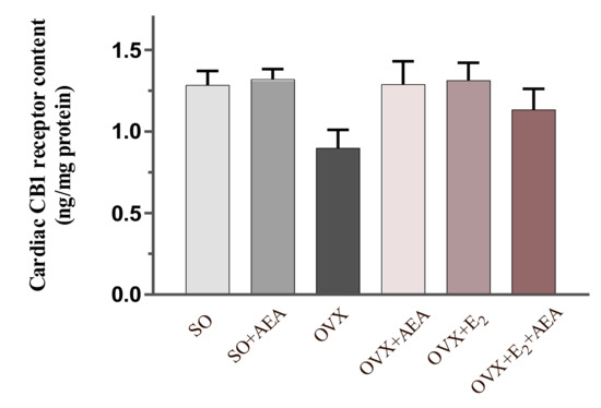 Figure 3 shows that the content of CB1 receptor was slightly diminished in the cardiac tissue of estrogen-deficient females. However, two weeks of AEA and E2 treatment compensated the decreased content of CB1 receptor.