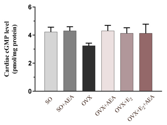 In order to detect AEA-induced cardiovascular effects, SO, OVX, and some OVX + E2 rats received intraperitoneal AEA injection at a daily dose of 1.0 mg/kg, for a total of two weeks; in this way SO + AEA and OVX + AEA subgroups were defined. In the group of rats who received both estrogen pretreatment and AEA injection (OVX + E2 + AEA), estrogen replacement was continuous during the AEA treatment period. Animals who did not receive AEA injection were treated with the same volume of vehicle (0.2 mL). At the end of the experiment, cardiac samples were excised, frozen, and kept at −80 °C until biochemical analysis. In our study, all efforts were made to minimize the number of animals as well as their suffering.