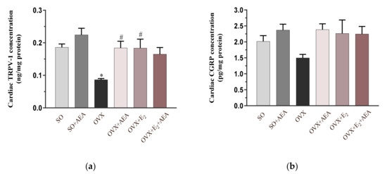 In accordance with the positive cardiovascular effects of CGRP, we found that AEA and E2 treatments improved the cardiac concentration of CGRP, which was diminished as a result of estrogen withdrawal. Figure 5b shows that CGRP concentration was similar in SO and OVX animals and in groups treated with AEA-, E2, or E2 + AEA.