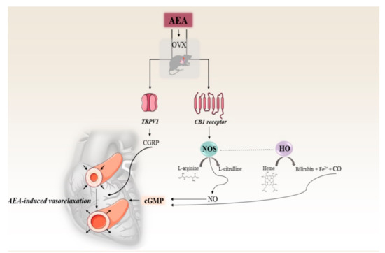An overview of the AEA-induced cardiac effects on NOS/HO systems and the TRPV1/CGRP pathway in estrogen-deficient conditions is summarized in Figure 6.