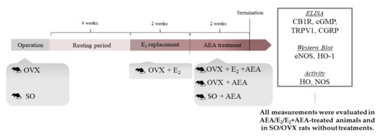In our experimental design, female Wistar rats were subjected either to ovariectomy surgery (OVX) to induce an estrogen-deficient condition or to a sham operation (SO) to create a similar stress situation (control group). Both estrogen (E2) replacement therapy and AEA treatment regulate the vascular tone and have an impact on NOS/HO systems; thus, their effects were analysed in the cardiac tissue of OVX and SO rats as well as in that of animals treated with estrogen (OVX + E2) or with both AEA and estrogen (OVX + E2 + AEA).
