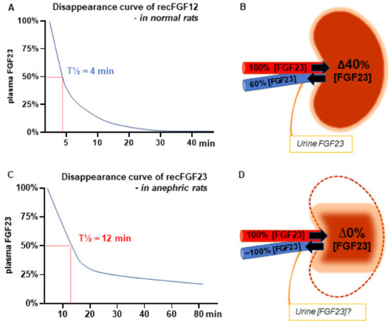 We estimated the half-life of FGF23 by measuring the disappearance of exogenous recombinant FGF23 in the rat and found a rather short half-life of 4 min (Figure 1A) [12]. To investigate the role of the kidney in the regulation of FGF23, we measured the concentration of FGF23 in the renal artery and renal vein and found a significant renal extraction of the hormone (Figure 1B). Commercially available ELISAs could not measure FGF23 in urine and we were therefore not able to calculate the renal clearance of the hormone [12]. Other groups detected FGF23 in urine samples using other, however, non-quantitative methods [2,27,28,29]. A later study in humans demonstrated a similar renal extraction ratio of FGF23, which was similar to that of creatinine [30].
