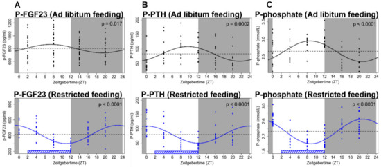 Circadian rhythm of FGF23 and mineral parameters. (A) Plasma levels of FGF23 show significant diurnal variation. Phase of fluctuation was complete reversed by feeding restricted to the inactive period (lower diagram). (B,C) Parathyroid hormone (PTH) and phosphate levels varied around the clock. Their acrophase and nadir were consistently shifted to the opposite value by the restricted feeding intervention. Data are fitted by cosinor regression and resulting p-values are shown, p < 0.05 is considered significant. Grey areas indicate dark period and white areas indicate light period. The figure has been published in Kidney International, Egstrand et al., 2020 [32].