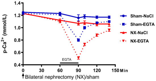 The role of the kidney in setting the set point for calcium sensing. Rats underwent bilateral nephrectomy (NX) or sham surgery. Removal of the kidneys resulted in a significant drop in plasma Ca2+, illustrating a role of the kidney in the setting of Ca2+ set point. The calcium chelator EGTA was infused via the femoral vein and it lowered plasma Ca2+ in both groups, however, more pronounced in the bilateral nephrectomized rats. The concentration of plasma Ca2+ remained, at all time points, significantly lower in these rats during recovery from hypocalcemia (p < 0.01). Data are presented as mean ± SEM. The figure has been published in BMC Nephrol, Nordholm et al., 2015 [96].