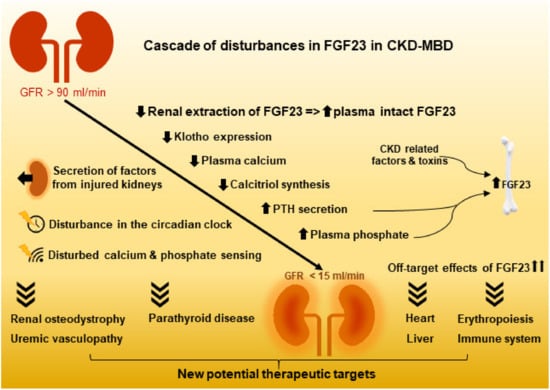 Patients with CKD have severely increased plasma levels of FGF23 and deficiency of Klotho. Epidemiological studies have repeatedly reported that FGF23 is an important factor associated with increased risk of progression of kidney disease, loss of kidney graft function, cardiovascular disease and mortality [61,62,63,64,65,66].