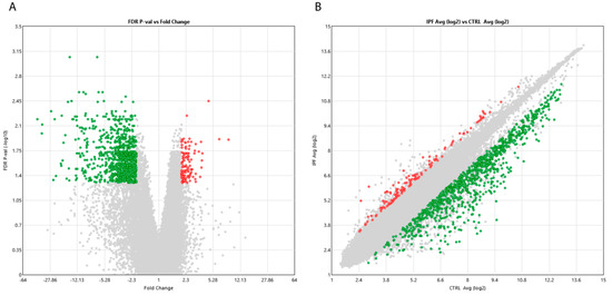 Volcano (A) and scatter plots (B) assessing the variation between Idiopathic Pulmonary Fibrosis (IPF) patients versus controls. The volcano plot visualizes the base 10 negative logarithm of the FDR-corrected p-values (Yaxis) and fold change deregulation values (X axis) (A). In the scatter plot, the values plotted on the X and Y axis are the averaged normalized signal values in each group (log2 scaled) (B). In both panels, red points in the plots indicate > 2.0-fold up-regulation of expression, green points indicate > 2.0-fold down-regulation of expression and gray points indicate < 2.0-fold change in expression. FDR-corrected p-value < 0.05.